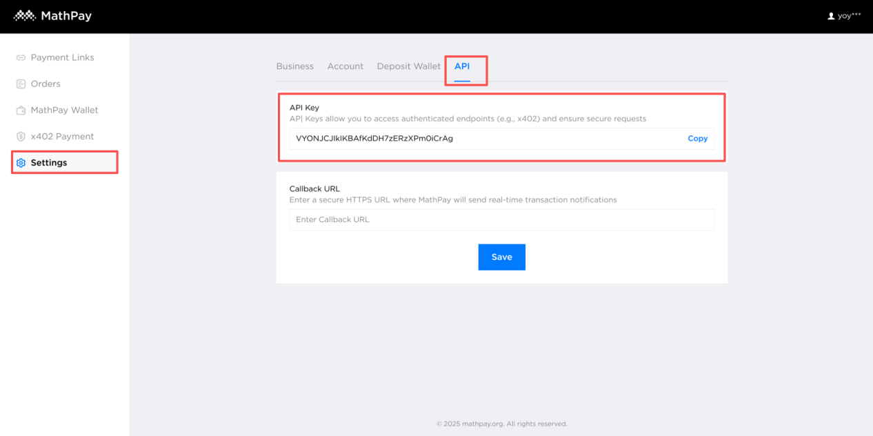 When calling the /verify or /settle endpoints of the MathPay Facilitator, you must include your API Key in the request header as follows: